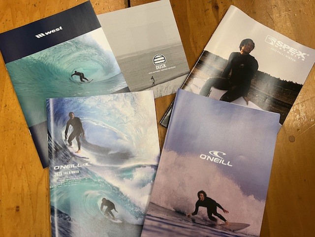 ウエットスーツでは各ブランドの配付用カタログも到着。