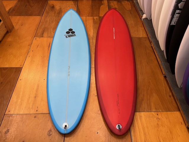 Y様はベストセラー【CI MID】(右)を7’0”47.2Lでご指定され、サンタバーバラ本社にてサイジングしてもらいました。カラーはブラッドレッドのレジンカーにまります。