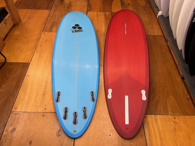 K様は【M23】(左)をご自身の好まれる6’8”47Lのご指定で幅と厚みをサイジング。カラーは所有するお気に入りデザインをリメイクをエアブラシでデザインされました。