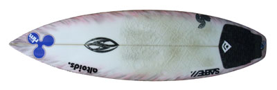 ワイドはレギュラーボードより1インチほど広いが、ノーズからセンターにかけてのアウトラインをシャープにすることと、センターのワイドも従来のツインフィンより下げることで縦へのアプローチも良くなっている。 このワイドの安定感+ロッカーを少し強めにし反応も良く、早いテイクオフからスピードにのせスムースにサーフできる。 センターフィンがないルースでスムースな乗り味はトライフィンにはない斬新な感覚です。